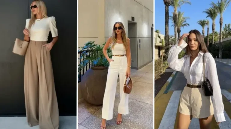 I love the sleek contrast of this fitted white tank against the flowing wide-leg trousers. The top’s snug fit highlights the waist, while the trousers’ silky texture adds a touch of elegance. A black belt cinches the midsection, creating a balanced silhouette. This combination works well for summer corporate outfits with its sophisticated yet relaxed vibe.